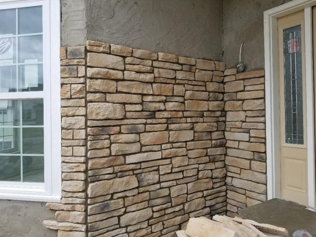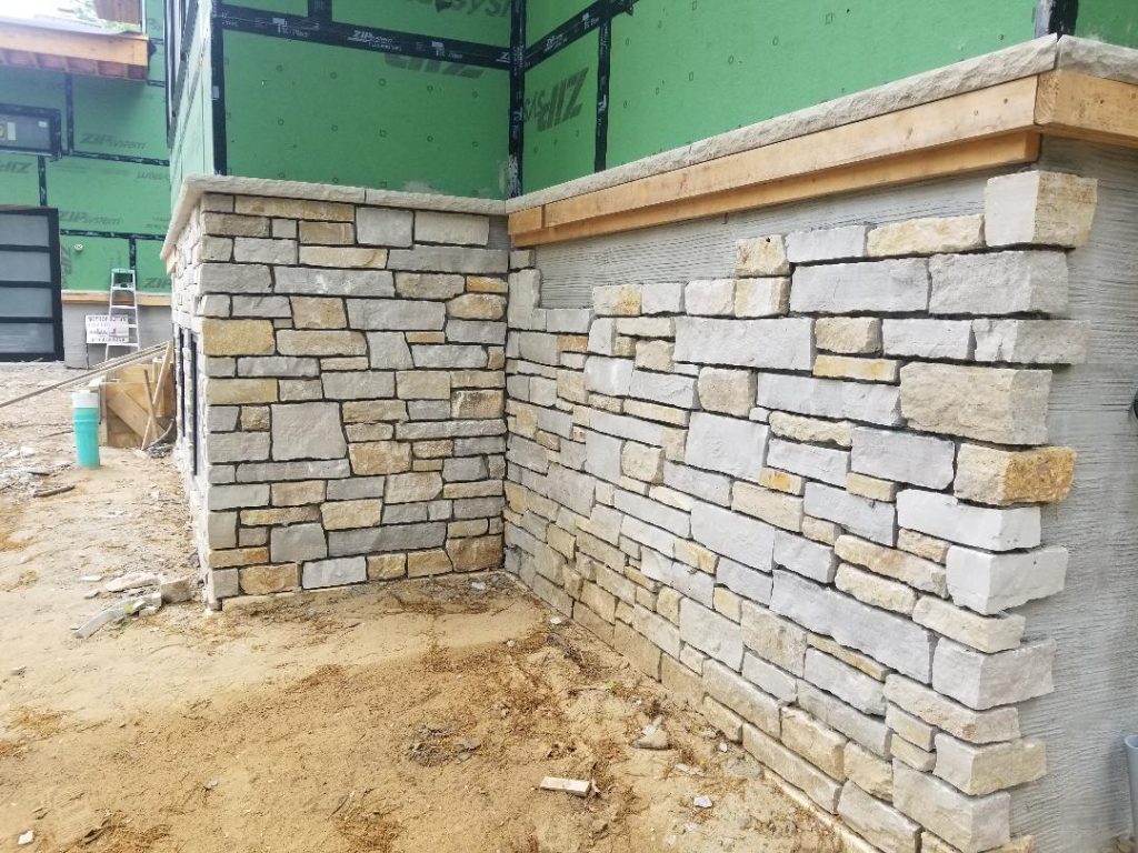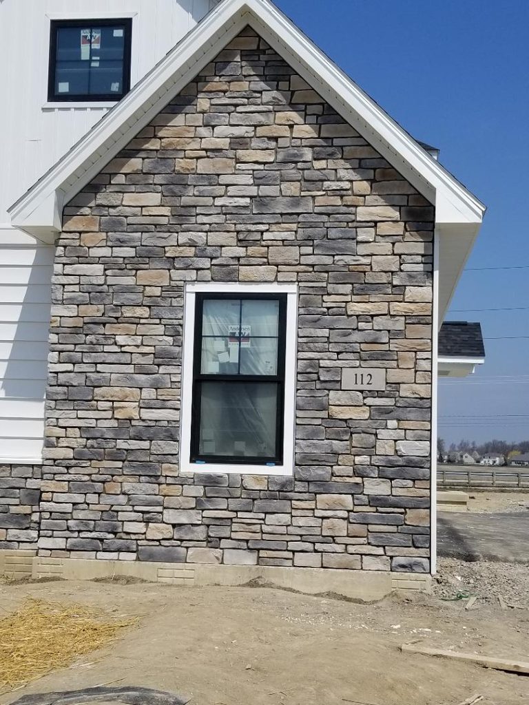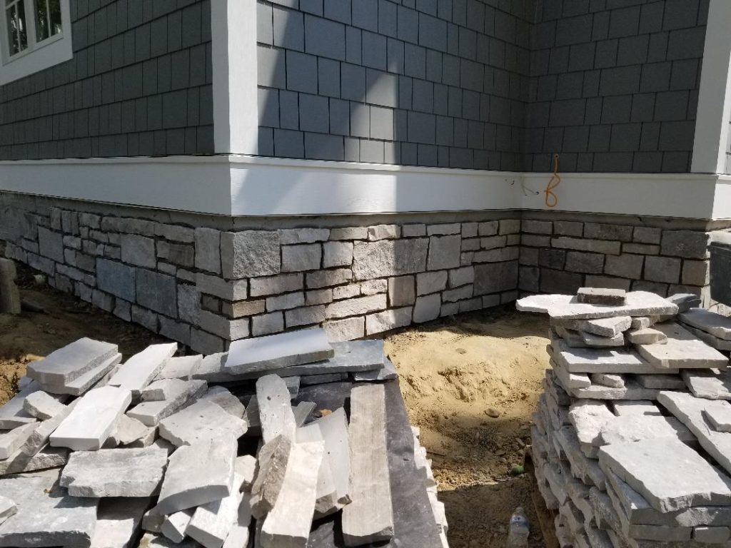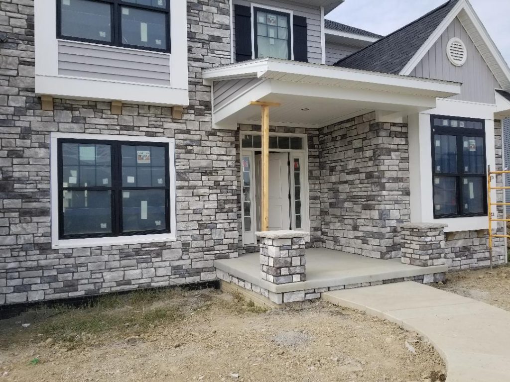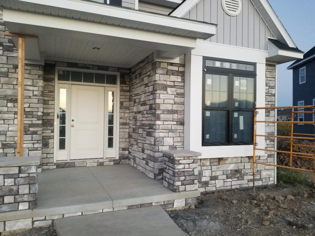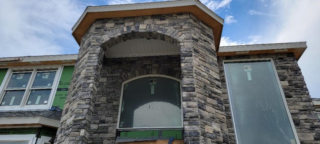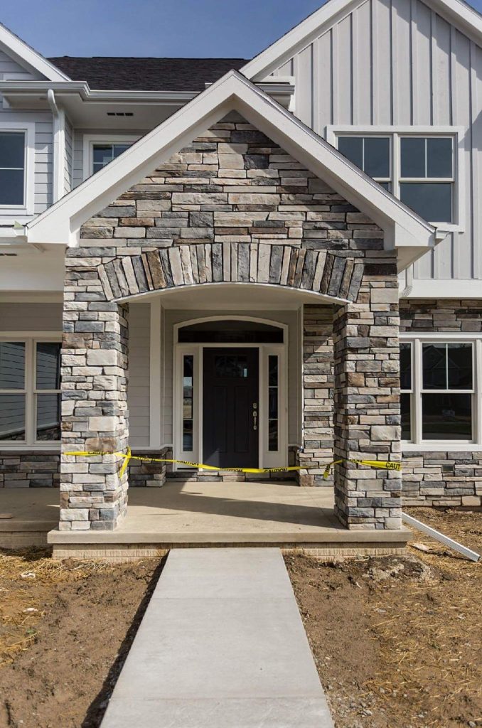 A collection of finished residential veneer work including stone, brick, and mixed-material installations.