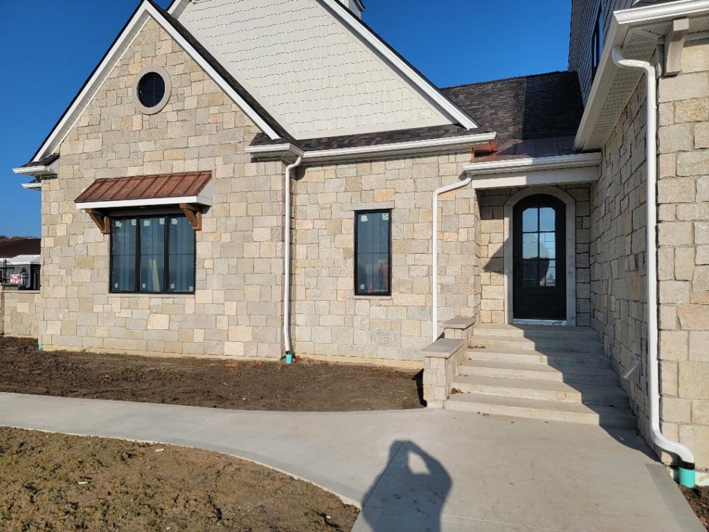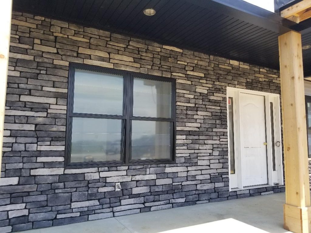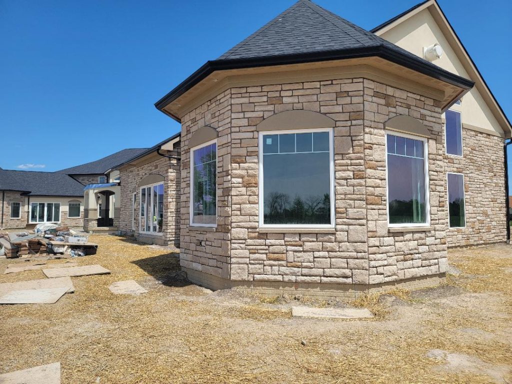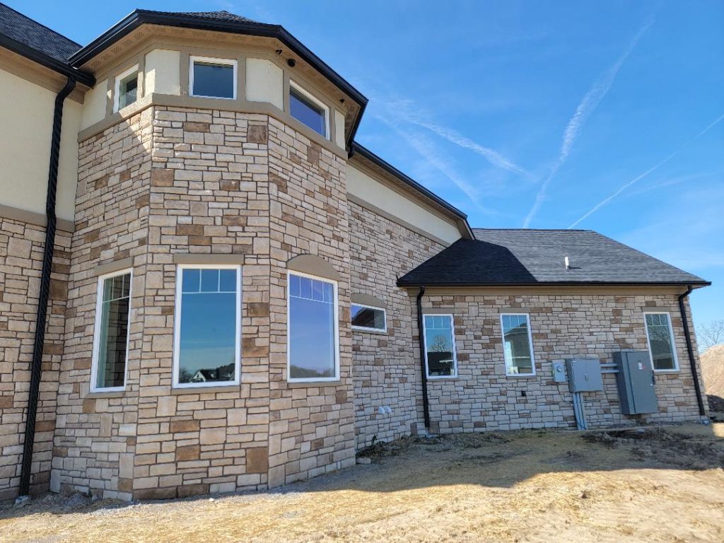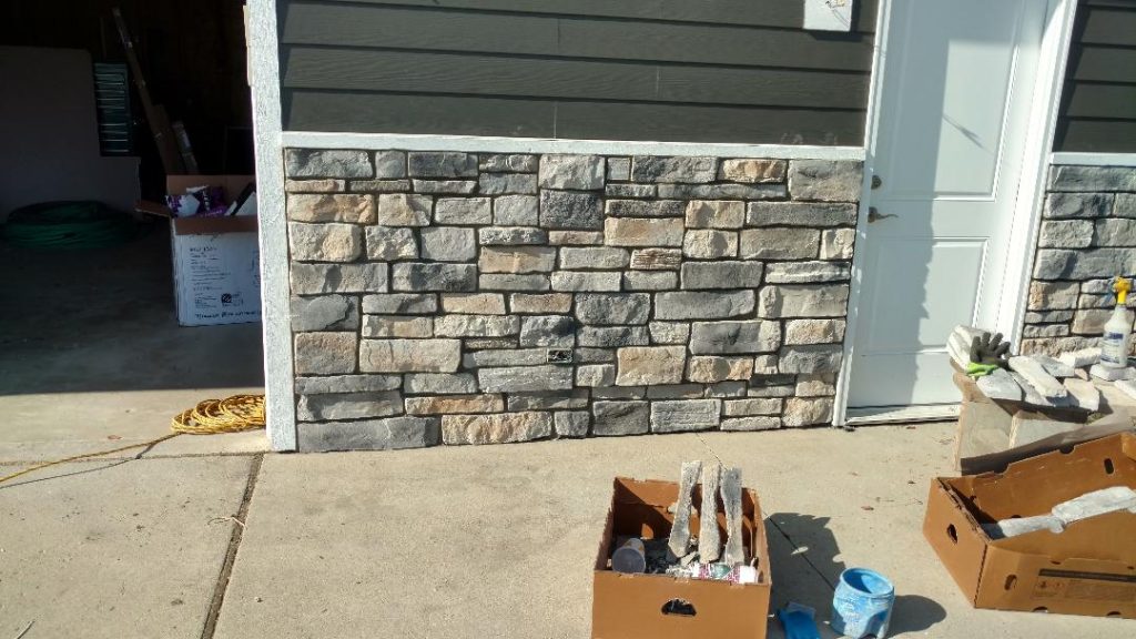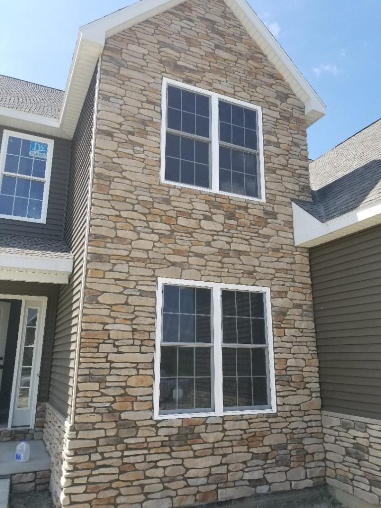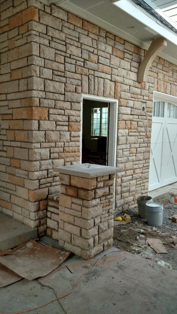 A collection of finished residential veneer work including stone, brick, and mixed-material installations.