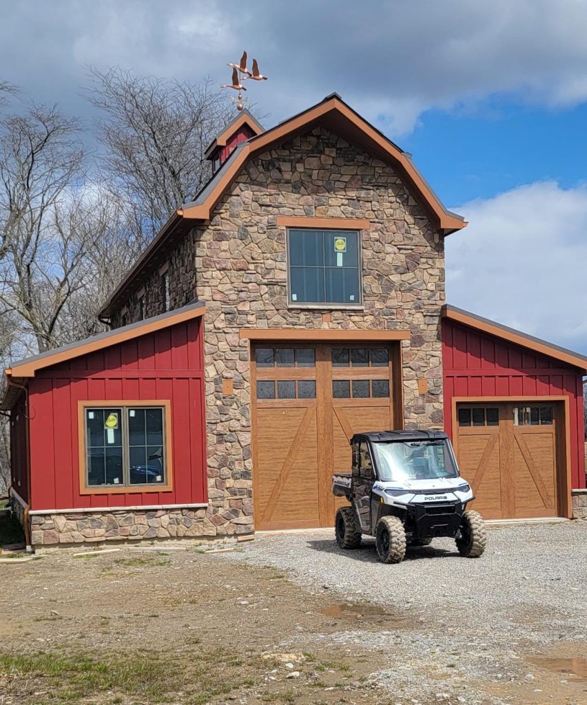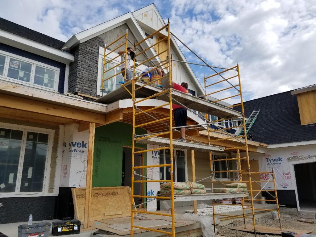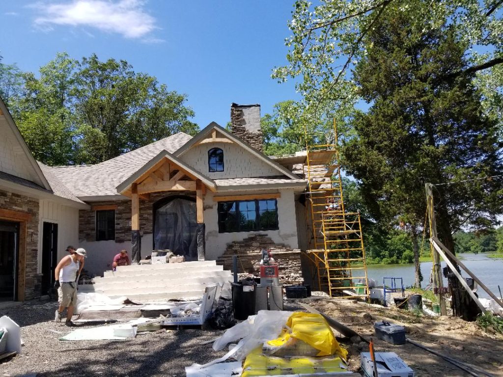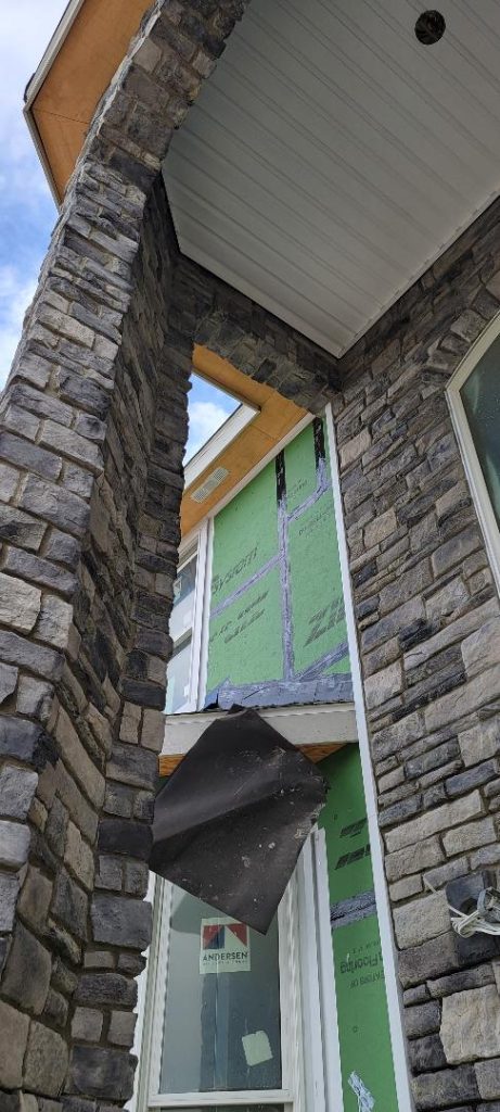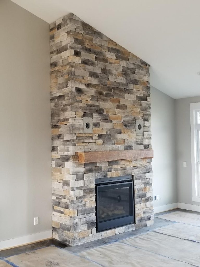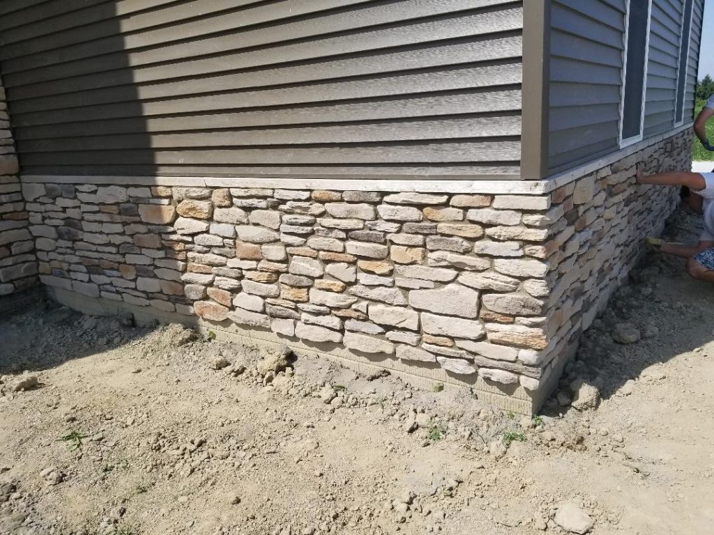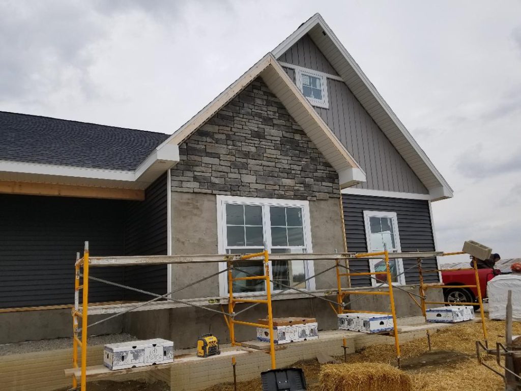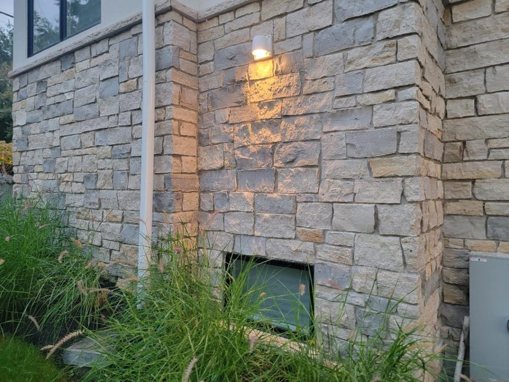 A collection of finished residential veneer work including stone, brick, and mixed-material installations.